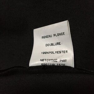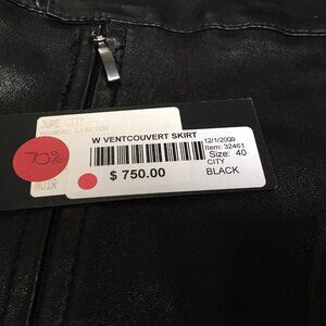 Black leather mini skirt by Ventcouvert in size 40. Made of "agneau plongé" leather ("plunged" lamb). This means that the leather is submerged in a dye bath, allowing the color to penetrate the entire hide without a protective topcoat. The resulting product is breathable and develops a natural patina over time. Front zip closure with a snap button. Waist (flat) 15 inches, hips (flat) ca 17 1/2 inches, length 17 1/2 inches. It has stretch to it, too! Worn once, in great condition, tag enclosed. Please note that the hem looks glued on the inside and some of the glue is coming off. There are also a couple glue (?) marks on the inside, see photo; that's how it was when I bought it from TNT Yorkville. It's unlined. Retail price is listed as $750, I paid $225.