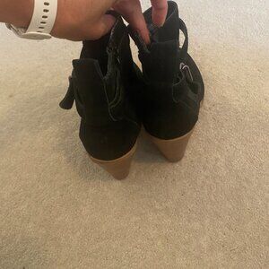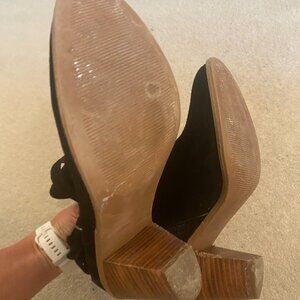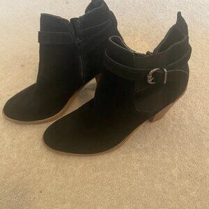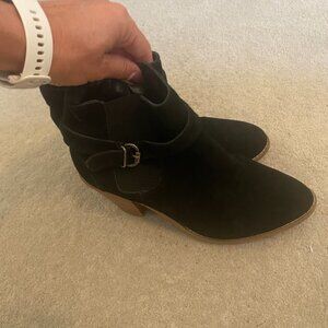 These hardly worn suede boots are a must to any fall wardrobe, casual or dressy. They are black and quite comfortable with a stacked heel that is 2.5" in height with a wide width for a wide foot.