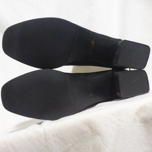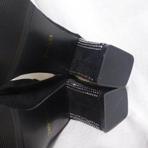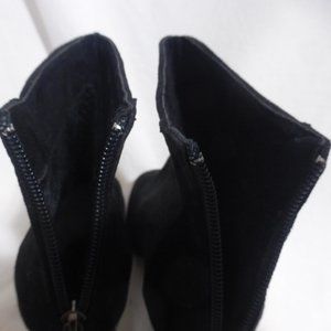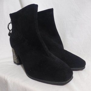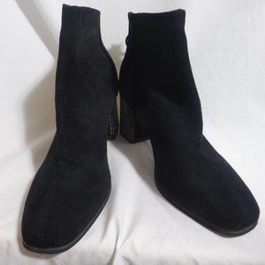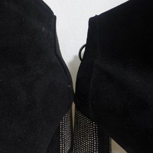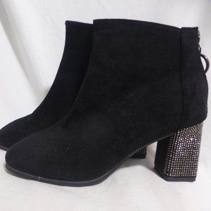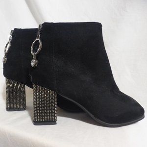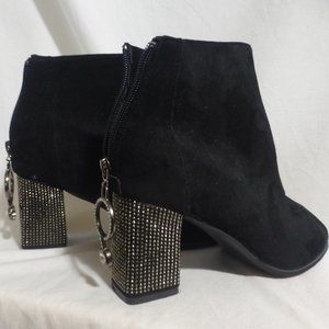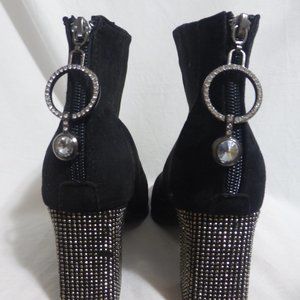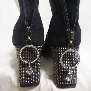Black suede boots with rhinestones detail on the heel and on the zip pull charm