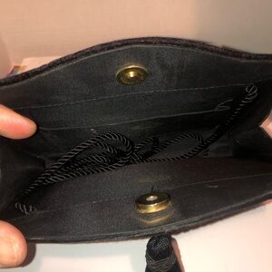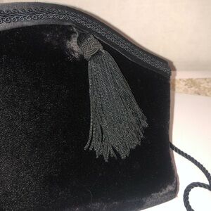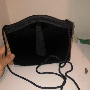 Black velvet like Clutch with Crescent Shape-tassel in front and cord strap.