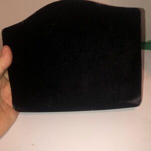 This black clutch features a unique crescent-shaped top edge and a velvet like fabric that adds a touch of sophistication. Its medium size and wide opening make it a practical yet stylish accessory for any occasion. Please check pics