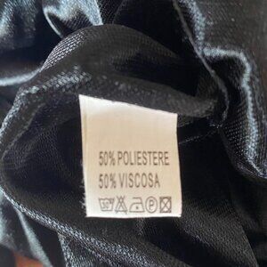 Black with tropical red and tan feather print lined chiffon midi dress, size L from Intrama Italy. Spaghetti straps, frill at bottom hem. Fits like a M, is stretchy and comfy. Purchased at a vintage store in the South of France. Bust measures 17.5 inches laying flat, waist measures about 14 inches, and length is 49 inches. Belt not included. Cat friendly, nonsmoking home.
