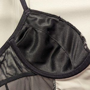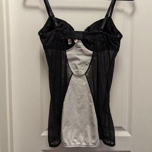 Description: Lightly padded (with opening to add padding) lingerie with wired bra in white satin, black mesh sides and black lace details.