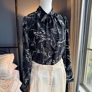 Black with cream plant twig (wheat?) print blouse, size 6 from H&M. Tie up bow at neck, buttoned sleeve hems, 100% polyester. Excellent used condition. Bust measures 19 inches laying flat, waist measures 18.5 inches flat, length from shoulder to hem is 25 inches at front, 27 inches at back. Cat friendly, nonsmoking home.
