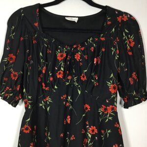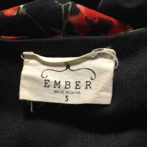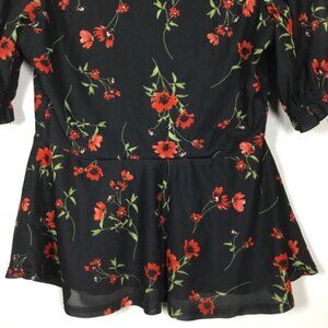 Excellent condition Ember tag size small blouse. Black with red flowers and green leaf pattern. Sheer sleeves with elastic at bottom. Sheer top with lining. Soft stretchy.