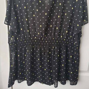 Black with lemon print, short sleeve, sheer, chiffon, button-up blouse