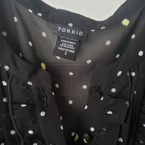 Torrid, short sleeve, sheer, chiffon, button-up blouse with stand up, rounded collar.