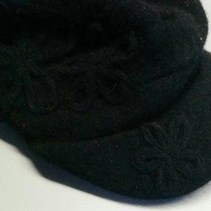 Black wool hat with black flowers embroidered on one side Barely worn, very good condition