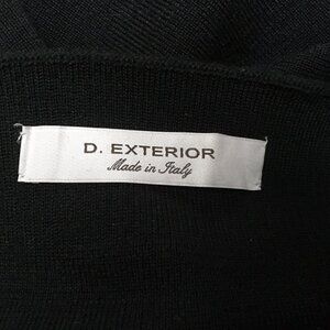 Black knit pencil skirt by D. Exterior in Size M. High waisted, knitted construction, slip-on style, pencil silhouette. Straight hem, no vent, mid-length.100% extra fine mid-weight wool, unlined. It's labelled as "M", but I think it's more like Small or Extra Small. Waist (flat) about 12 inches, hips (flat) 14 inches, length 25 inches. New, never worn, without tags. Please note that the brand label is off on one side.