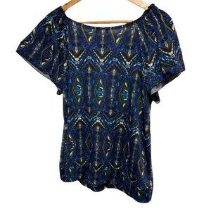 Black/Blue/ Gold Graphic Print Short Sleeve Peasant Blouse w/ Ruched Neckline