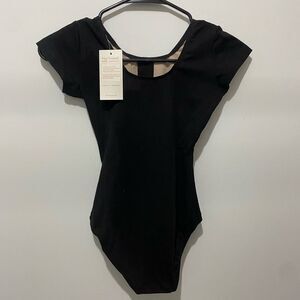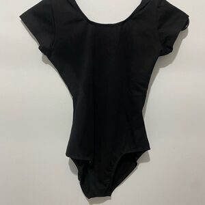 This sleek black bodysuit features short cap sleeves and a scoop neckline, offering a classic silhouette perfect for dance or athletic activities. Made from a stretchy, form-fitting material, it ensures comfort and a full range of motion. The solid black color adds a touch of elegance to this versatile piece.