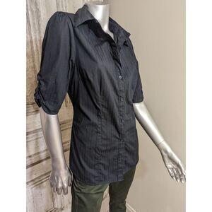 Black button-through top with 3/4 length sleeves, black-on-black pinstripe pattern and ruched sleeve detail. Great condition. Looks incredible with a pencil skirt! Size M.