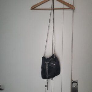 Phone, key, purse-- sorted. This little evening bag is the perfect finishing touch to all your party outfits. Made from a smooth velvet fabric. Barrel slider closure with iridescent tassel detail. Internal zip pocket and a long chain shoulder strap.