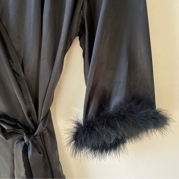 Black satin robe with flared sleeves and removable faux fur / feather boa trim S