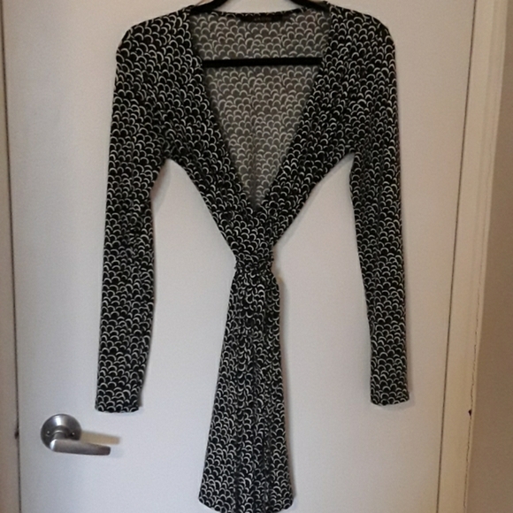 So flattering! Black and white patterned mini wrap dress. Can be tied on either the left or right side. Purchased at Mendocino