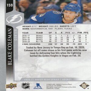 Blake Coleman (Lightning) 2020/2021 Upper Deck Series 1 Hockey Card - Number 159