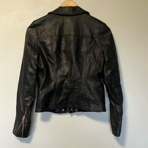 Elevate your style with this sleek black vegan leather jacket. Perfect for any occasion, it offers a timeless look and comfortable fit.