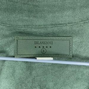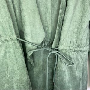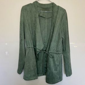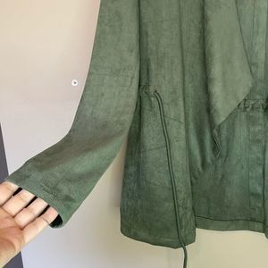 Stylish olive green jacket. Open front design. Soft and comfortable material. Perfect for layering.