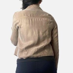 Excellent used condition! Tan super soft faux silk lightweight jacket. Cupro cotton blend. Silver hardware with full zip closure and zippers on cuffs. Notched collar with zippered side pockets and button accents.