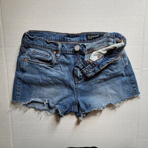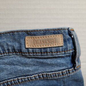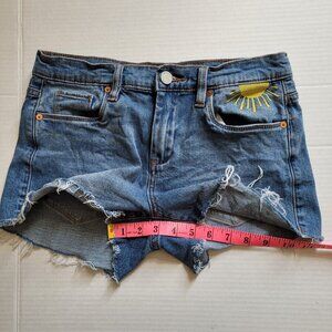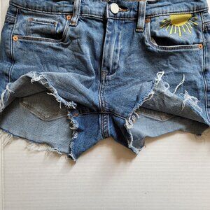 Blank NYC jean shorts. The Astor Cut off shorts. Distressed denim cut off style. Medium wash. Waist and back pockets. Belt loops. Marked a size 27. Embroidered sun on the left front pocket. Embroidered rainbow on the left back pocket. 99% cotton and 1% spandex. There are not any stains or unintentional tears, or holes. Very good, gently used condition.