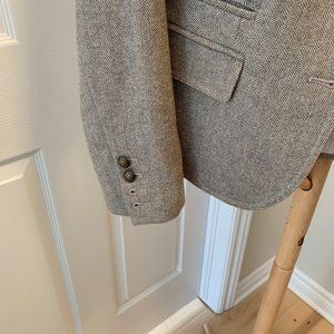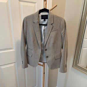 Banana republic factory blazer. Size 4 petite. Fitted. Tweed, brass button detail. Small stain on inside lining at neck. Otherwise very good condition. Wool, rayon, polyester.