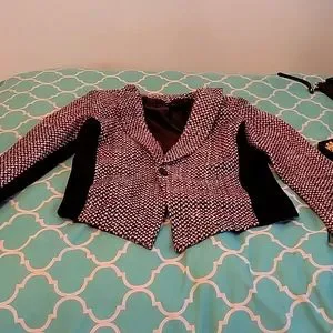 Beautiful fitted blazer. Has specs of pink, green and black on it. Very striking and flattering