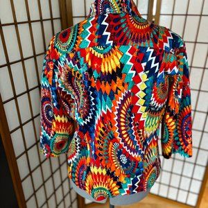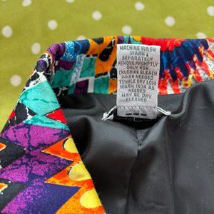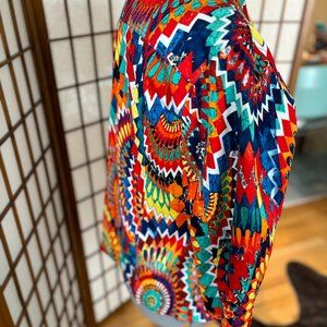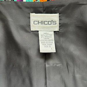 Beautifully comfortable and bright multi colored blazer with button front, mid hip length, loose fit, 3/4 length sleeve, collar can be popped or laid flat. Chico sizing (3), measurements: underarm to underarm 22 inches, sleeve length 19 inches, back width 18.5 inches, back length 25 1/4 inch,