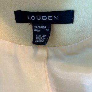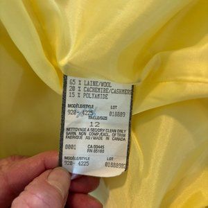 This lemon yellow jacket is a wool/ cashmere blend with a mandarin collar, zipper front, and front pockets. There are princess seams front and back which gives a nice shaping to the jacket. Size 12, measurements: underarm to underarm 22 inches, sleeve length 24 inches, back width 17 inches, back length 23 inches