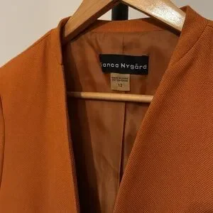 Blanco Nórdico burnt-orange blazer. It has a minimalist, collarless design with two front pockets.