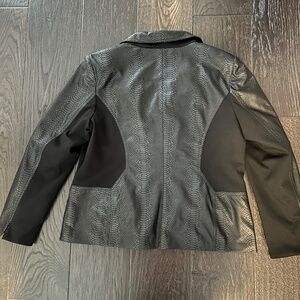 Black Blazer with zipper front. Side panels are stretchy Polyester and Rayon