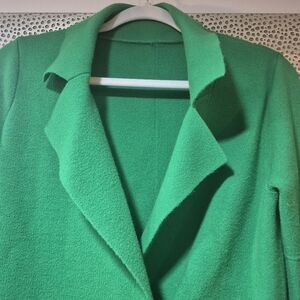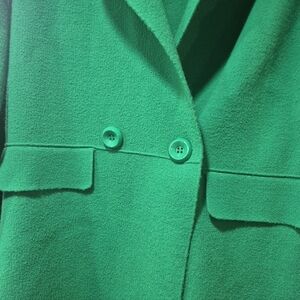 This vibrant green blazer style sweater is in good condition, rarely worn. Heavy weight sweater material with the structure and style of a blazer or jacket. Functional buttons to be worn open or buttoned. Could be worn as a layering piece or even a short dress. Perfect for dressing up for a classy look this winter. There is no tag size, but fits a medium to large.