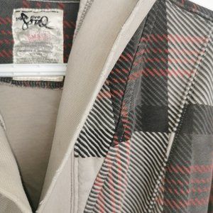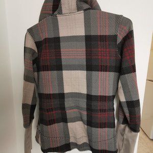 Red black and grey houndstooth plaid printed blazer style sweater with clasp front. Extra large hood. Hi low style by Triple Five Soul