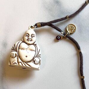 Serene Buddha pendant signed Blee Inara on woven adjustable rope. Buddha is approx 1.5" H and 1" wide at base. This talisman includes a gold tone eye circlet and a glass bead for protection against the evil eye. "Inara" means "shining light" - and that is the aura that emanates from this delightful piece. The rope is knotted to size the necklace larger or smaller by sliding the knots. Length ranges from approx 28" (fully extended) to approx 20" (excluding pendant). Buddha is cast in molded resin. Some signs of wear on woven cable - please see photos.