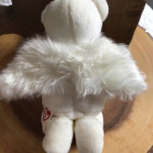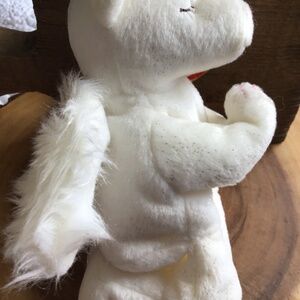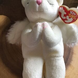 Blessed is made from a white material with black stitching for her eyes to make them appear closed, and a pink embroidered nose. She has white fluffy angel wings on her back. Blessed is posed in a kneeling position as if praying.