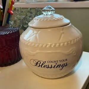 White ceramic jar labeled “count your blessings”. Has numerous blessing cards inside. Acrylic handle made to look like a gem 💎.