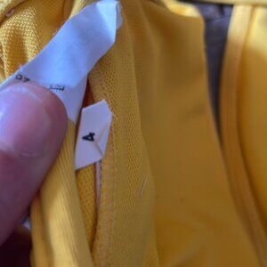 Bright yellow bikini top with ruffled straps. Features a front tie detail.