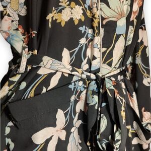 Beautiful Black Floral Boho Kimono Style Duster. White piping Trim, Belt, Two Front Patch Pockets And Side Split Seams. Perfect As A Cover Up, Dress It Down Open With Ripped Jeans Or Dress It Up Over A Dress. Light Weight, In Like New Condition.