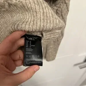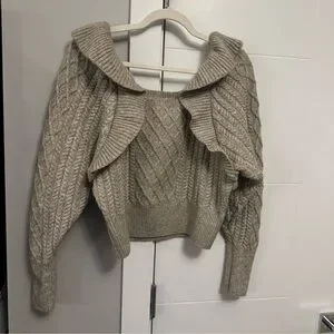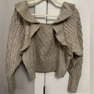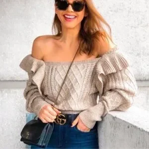 Turn heads with this gorgeous off-the-shoulder cable knit sweater. The intricate knit design and soft beige color create a cozy yet chic look. Its flattering neckline and voluminous ruffled sleeves add a trendy twist, making it perfect for casual or dressy occasions. Style it tucked into jeans or layered over a skirt.