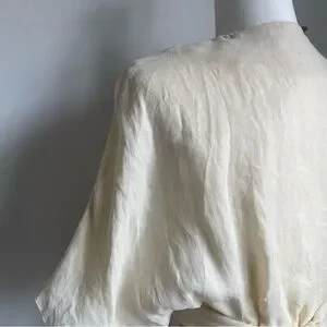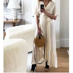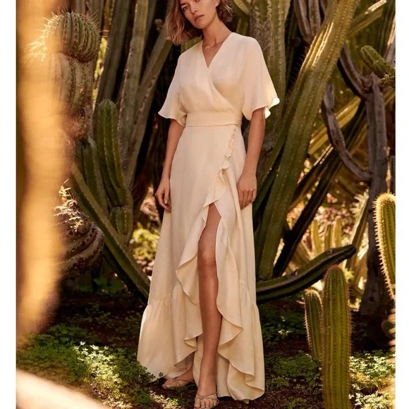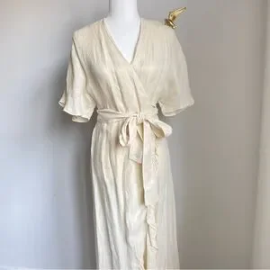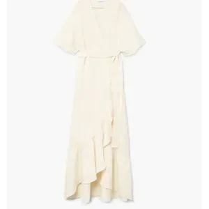 Lightweight cream wrap maxi with soft ruffle detail. V-neckline and short flutter sleeves.