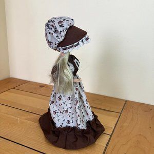 Vintage Bradley-style collector doll with tag is 9" tall. Dressed in brown floral print dress & bonnet with white pantaloons and brown plastic boots. Blonde hair with blue eyes. On wooden stand, ready for display. Bottom of stand says "Korea". Bottom of skirt measures approx. 6" across. Pre-owned vintage condition: small spot of brown paint in the left pigtail, discoloration on front of skirt. See photos.