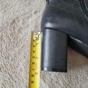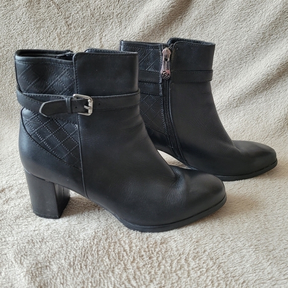 Black ankle boots with comfortable 3" high block heel. In good used condition, faint scuffs on the toes, small mark on one heel