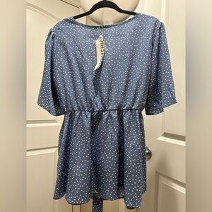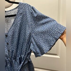Chic blue top with playful white polka dots. Features a stylish button-up design.