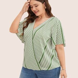 BloomChic Plus Size Geometric Contrast Ruffle Sleeve Wrap Blouse