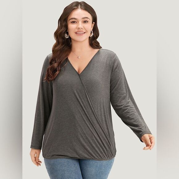 Long sleeve wrap shirt V-neck, overlap collar Approx flat measurements: Pit to pit 28”, length 31”
