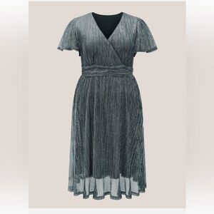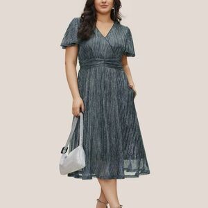 Bloomchic Plus Size Glitter Mesh Surplice Neck Ruffle Sleeve Pocket Midi Dress