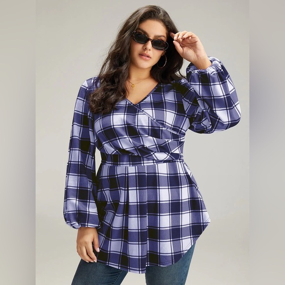 Bloomchic, size 18-20, blue and white plaid, long sleeve tunic faux wrap shirt