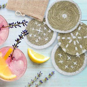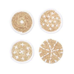 Bloomingville Round Hand-Embroidered Bohemian Seagrass, White Woven Coasters