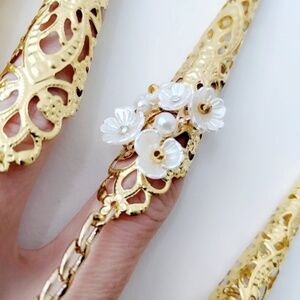 Sweet and unexpected, little flowers and rhinestones adorns this filigree finger claw and adds an extra touch of drama to your look.