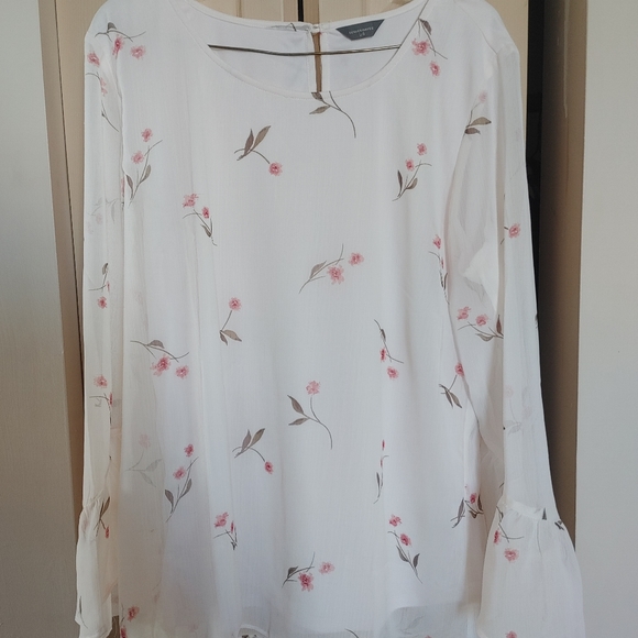NWOT. Light pink with little flowers in the pattern. Long bell sleeves and comes with a liner so not see through. 100% Polyester. One button at the back of neck to do up.