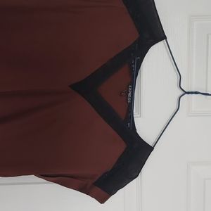 Satin silk chocolate cap sleeve blouse with black lace inlay.